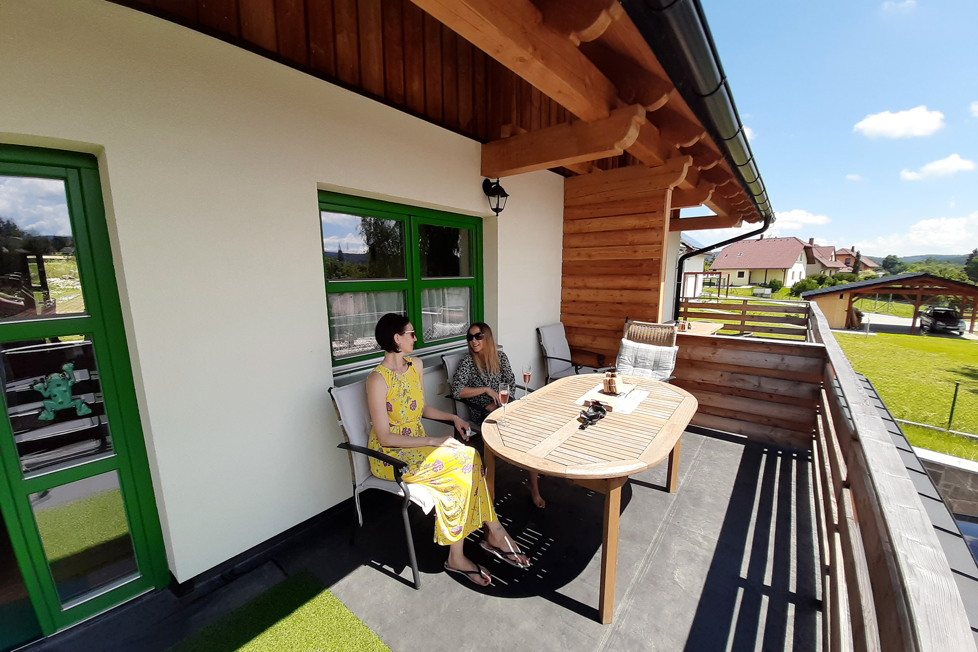 Oba apartmány mají přímý přístup na společnou zadní terasu, která vede do rozlehlé zahrady s ohništěm a zahradním domkem. Jde o příjemné místo pro letní večery, chvíle odpočinku i posezení s rodinou či přáteli po výletech nebo lyžování.