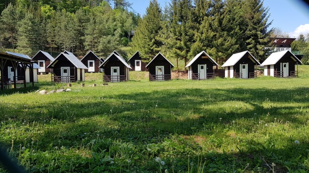 Areál se skládá ze čtyř lůžkových chatek se společným či vlastním sociálním zařízením a šesti lůžkové chatky s vlastním sociálním zařízením. Disponuje velkým ohništěm, kde můžete trávit romantické večery při opékání buřtíků. Čeká tu na vás krytá pergola s posezením pro trávení volnočasových aktivit. Celý areál je oplocený s elektricky ovládanou bránou pro vjezd osobních automobilů a uzamykatelnou brankou pro přístup k řece. Parkování automobilů či karavanů v areálu je možné na místech k tomu určených. Areálu dominuje hlavní budova, její součástí je sklad pomůcek a vybavení, sklady a sklepy pro uchování potravin, jídelna-společenská místnost a velká bohatě vybavená kuchyně. Na hranici tábořiště se nachází u řeky stylová výletní restaurace Saloon Šárka s vnitřním i venkovním krytým posezením. Máte tu prostě vše potřebné pro příjemně strávený čas a dovolenou.
