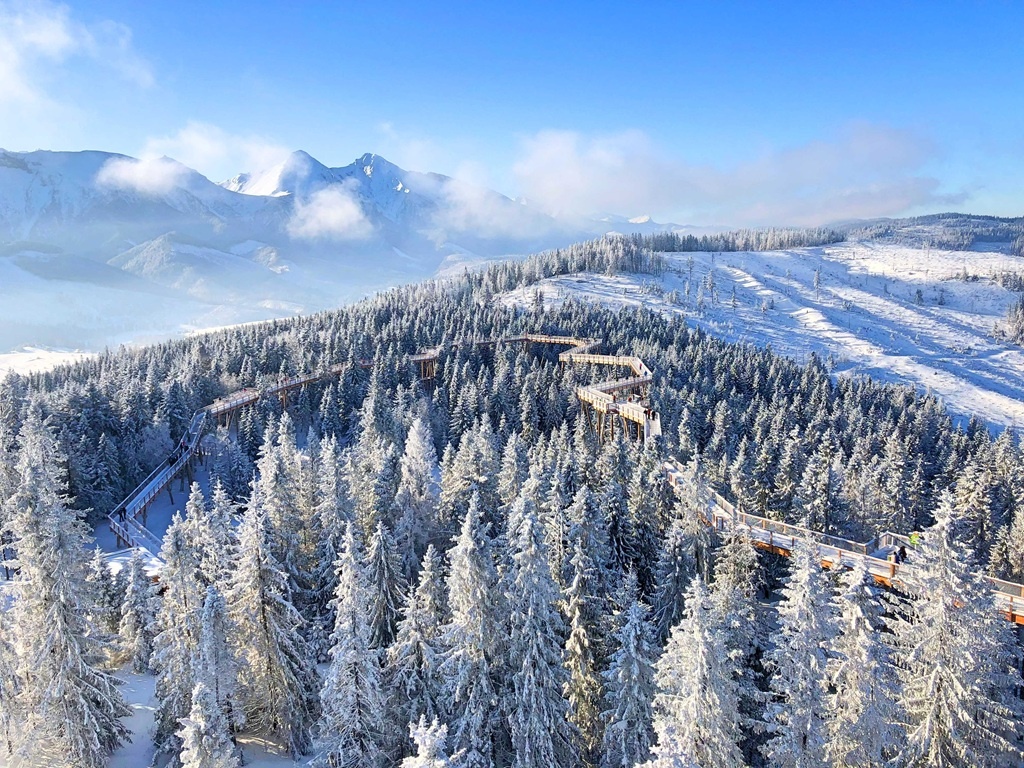 Nádherné výhledy na panoráma zasněžených Belianských Tater si nejlépe vychutnáte ze Stezky korunami stromů. Jeho součástí je i 32 metrů vysoká vyhlídková věž s adrenalinovou sítí na vrcholu.