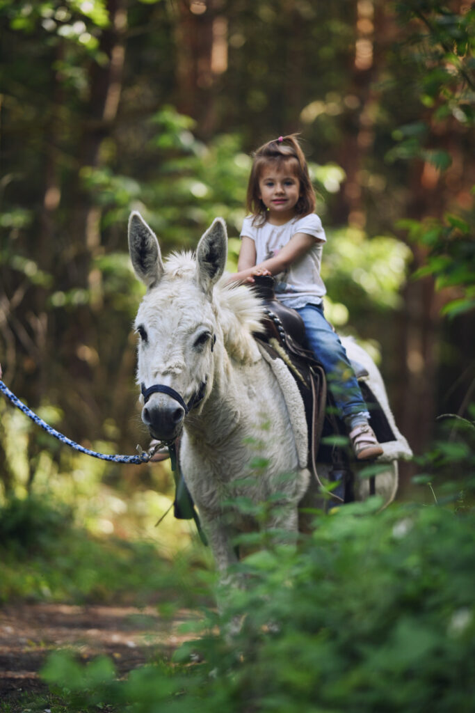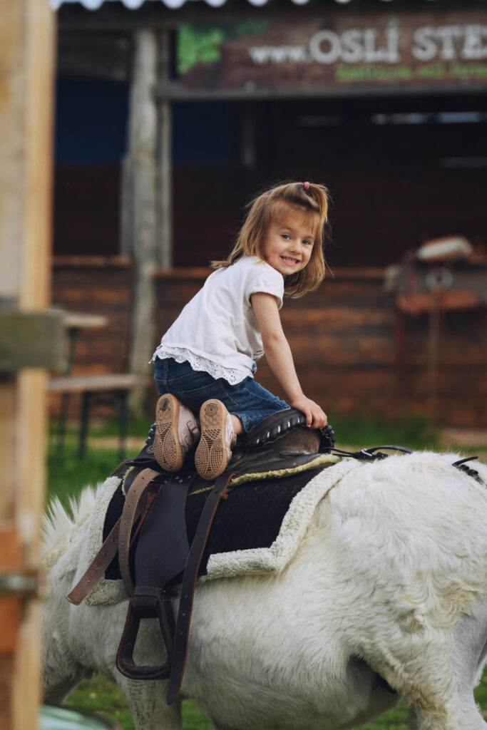 Tento úžasný projekt získal právem hned několik ocenění. Přijeďte se sami přesvědčit, nebudete litovat, prožijete tu parádní zážitek a zábavu. Je to skvělé místo, kde je cítit láska a úcta ke zvířatům. Na rodinné oslí farmě na vás čeká komentovaná prohlídka farmy, seznámí vás zde s oslíky vzácných druhů a různých plemen, třeba s mini oslíkem nebo s oslem velkým francouzským. Těšit se můžete na procházku a svezení se v sedle (jen osoby do 50 kg) nebo se můžete s oslíkem projít překážkové dráhy. Přeskočíte přes potok, vyšplháte se do kopce a pokoříte i další překážky. Každá rodina či skupinka si vede “svého“ oslíka, menší děti se vezou, ti větší oslíka vedou. I oslík má totiž své limity a neuveze úplně každého. Můžete se s nimi mazlit, hladit je, kartáčovat či je krmit mrkvičkou.