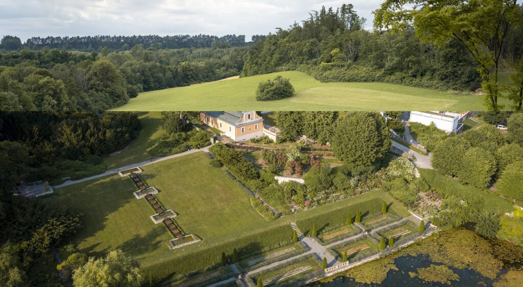 Okolí zámku tvoří upravené zahrady a anglický park, určené k procházkám a odpočinku. Jedná se o soubor 11 stylových zahrad dnes již na rozloze téměř 20 ha, v nichž nechybí četné vodní prvky, jakými jsou rybníky, kaskády, kašny či bazén s lekníny, ale také umělecké plastiky rozmístěné v plenéru. Malí návštěvníci ocení kromě labyrintu i stylové hřiště na starém hradním návrší.